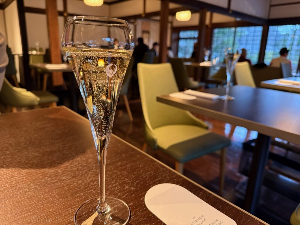 毎日17時から19時に開催されているフリーフローに参加しました。宿泊者限定でシャンパンなどのお酒が楽しめる夢のような時間です。客室とは別棟の『茶寮 世世』で開催されています。こちらの建物も隠れ家のような雰囲気で素敵なんですよね。縁側に敷かれた赤色の敷物が素敵さをアップさせています。