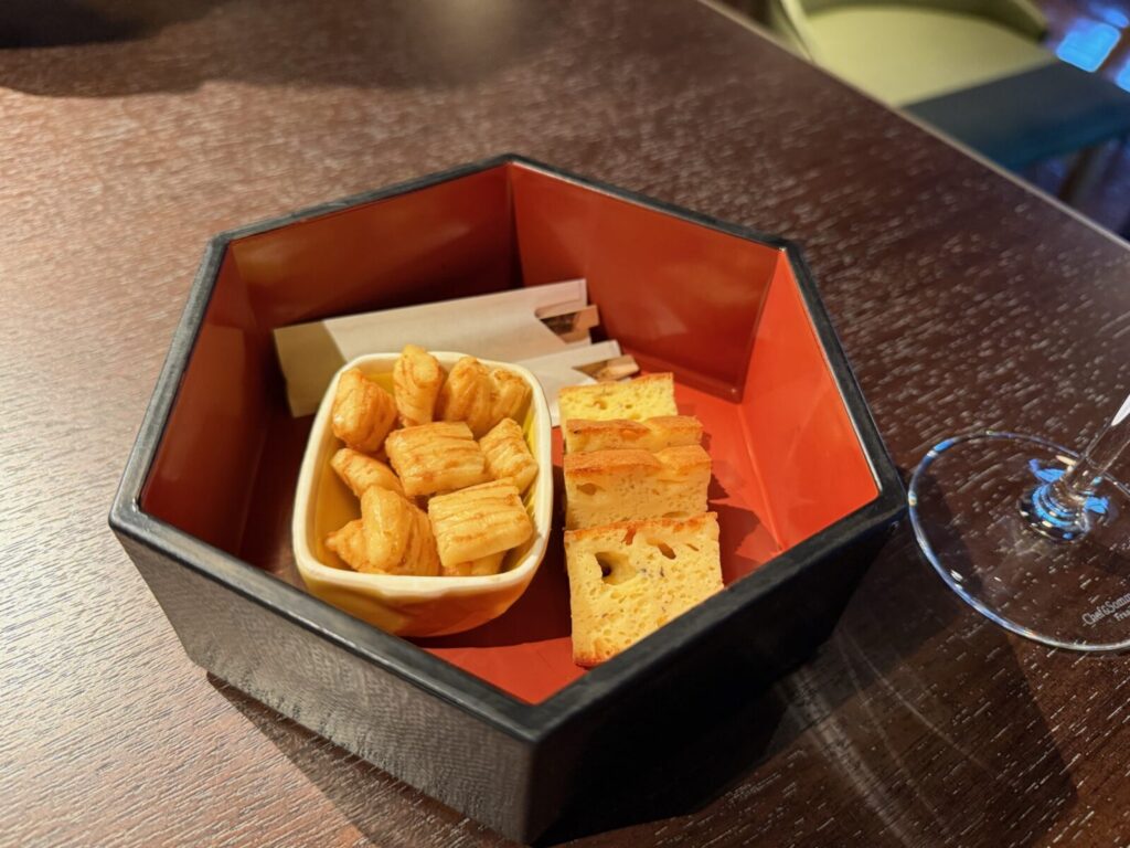 シャンパンとおつまみがサーブされました。ラウンジがあるホテルと比較すると物足りなさは拭えませんが、ゆったりとした上質な時間を味わうことができます。