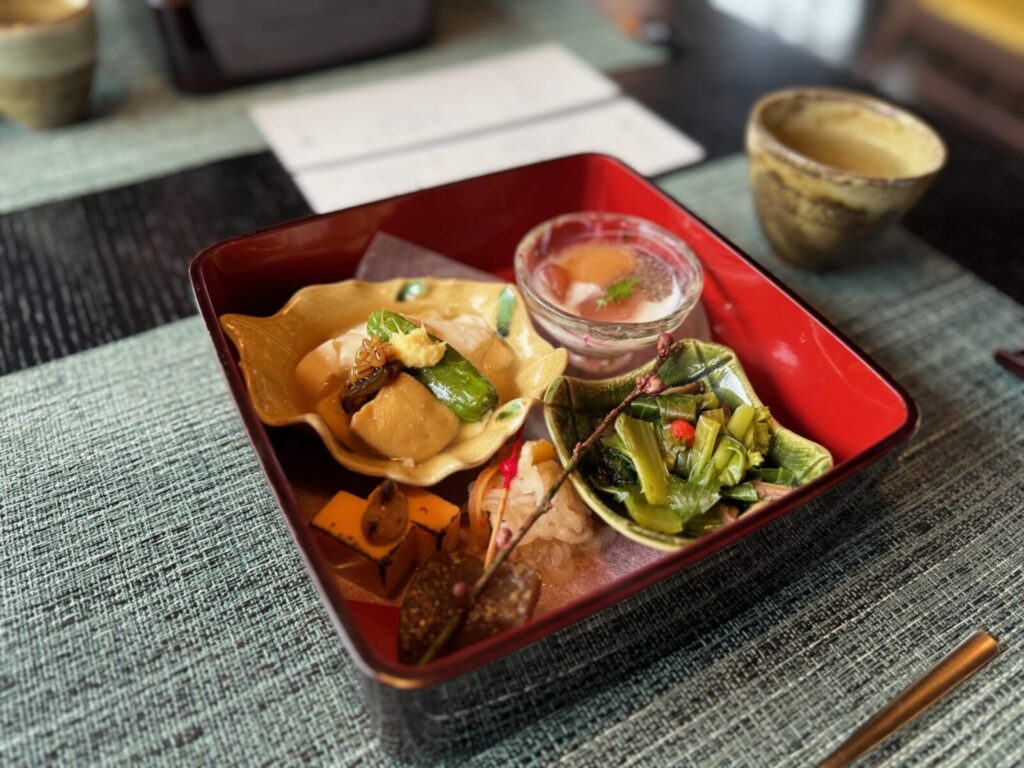 まずは1つ目のプレートが届きました。梅の木が添えられていて、春を感じさせるような盛り付けです。