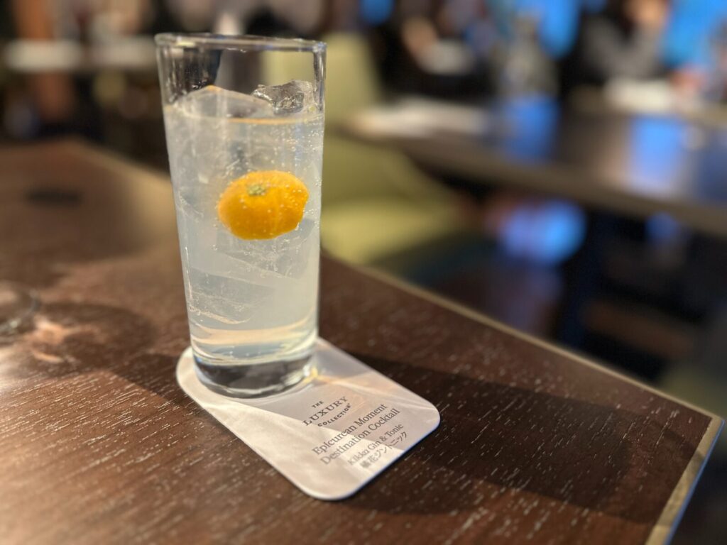2杯目はシグネチャーカクテルにしました。浮かんだ金柑がアクセントになっていて、ジュース感覚の飲みやすいお酒でした。