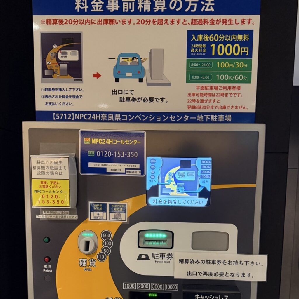 今回は車で行ったので近隣の駐車場を利用しました。JW奈良ホテル内の駐車場に停める場合は1日2,000円かかります。ホテルの真横にある奈良コンベンションセンターの地下駐車場であれば、24時間1,000円で節約ができちゃいます。キャッシュレスでも支払い可能です。雨の日でも、ホテルの玄関口まで屋根があるので濡れずに移動できます。
